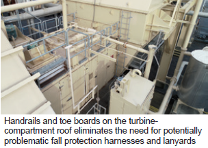 At Ferndale Generating Station, each gas turbine’s compartment roof, approximately 12 ft from ground elevation, is accessed frequently to maintain equipment. Without handrails in place, fall protection harnesses and lanyards would be required.