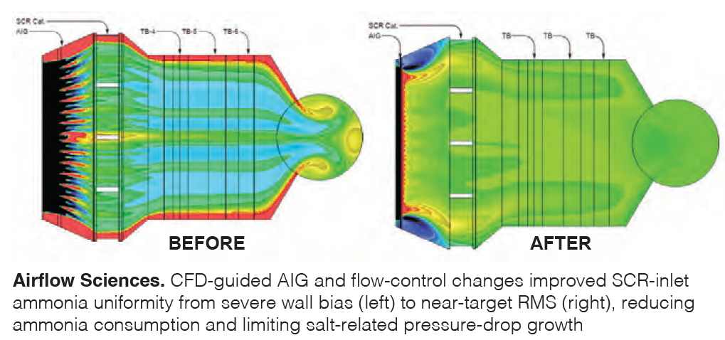 In an HRSG example tied to ammonium-salt fouling and high gas-side pressure drop, AIG redesign and perimeter flow control improved distribution at the catalyst face, stabilized pressure drop over time, and reduced ammonia consumption, while also reducing the need for frequent tube cleaning. The conclusions stressed that seals, baffles, and simple flow devices had outsized performance impacts.