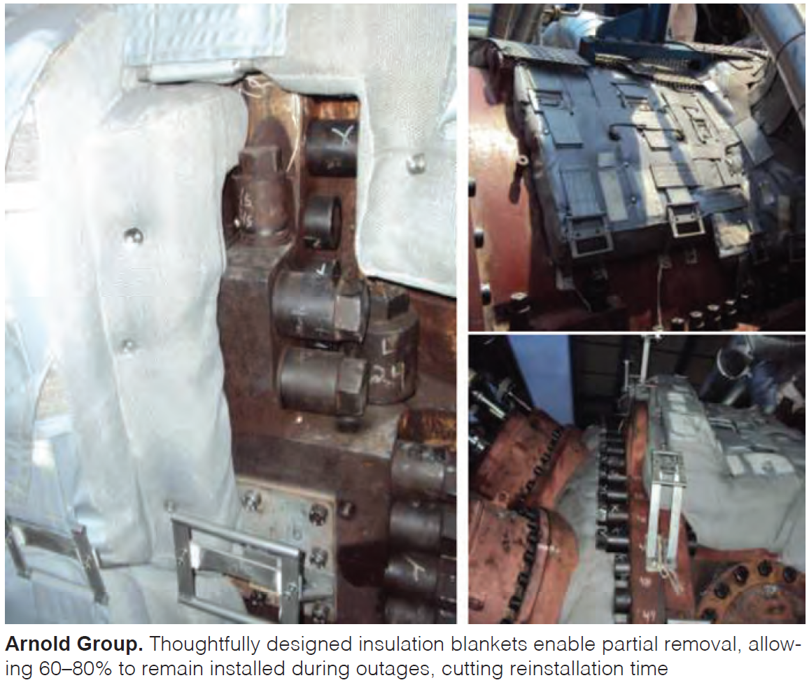 The system features interlocking 45° interfaces between blankets to accommodate thermal expansion without creating gaps, eliminating hot spots that can damage nearby components. A stainless-steel substructure fixed by stud welding provides permanent support and safer access for maintenance, while high-temp Velcro fasteners allow selective removal during outages without disturbing adjacent sections. This approach enables up to 60–80% of insulation to remain installed, saving one to three days in outage reassembly time.