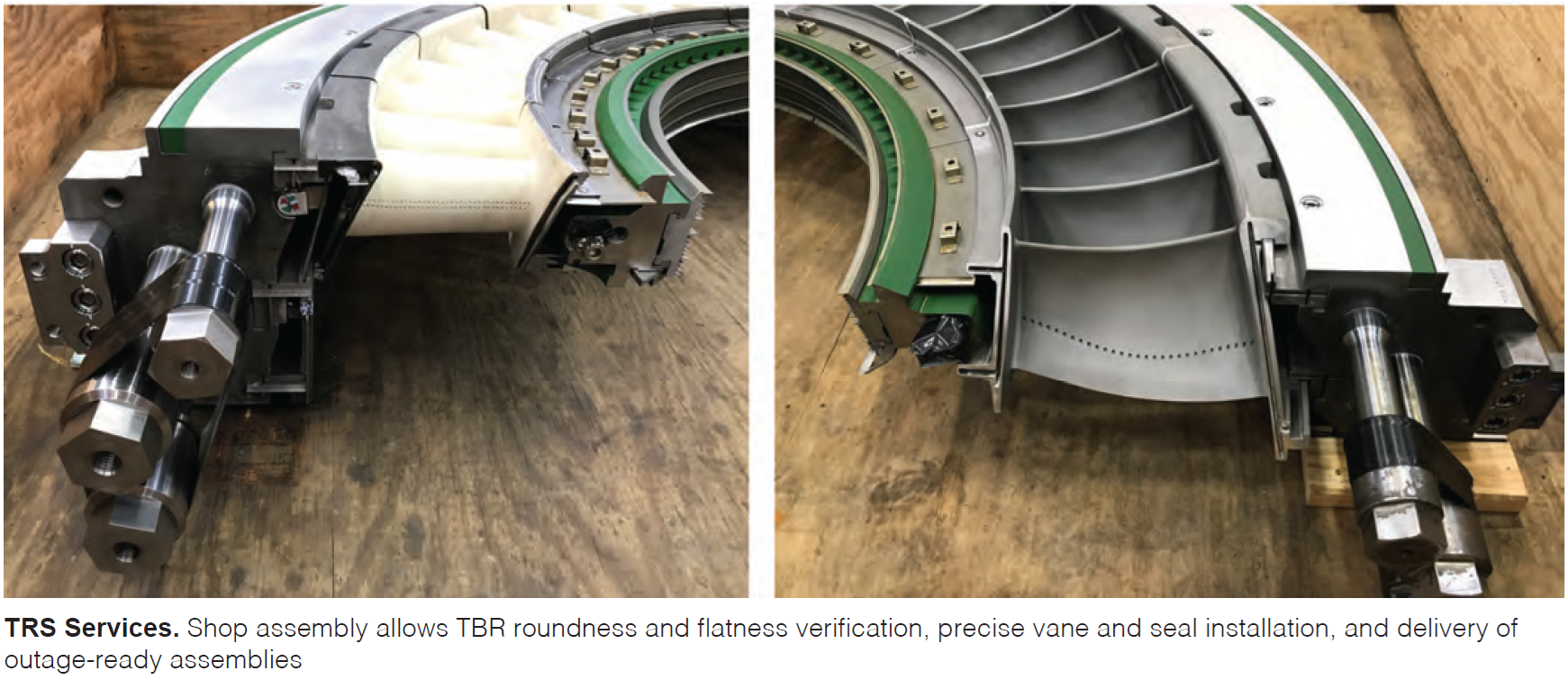 Using precision jacking fixtures, TRS restores roundness from 0.117 to 0.037 in. total indicator runout and flatness from 0.085 to 0.022 in. Repairs include dimensional restoration, downstream deflection correction, and braze preform applications for vane and seal surfaces. Performing TBR centralization and assembly in a controlled shop environment ensures alignment accuracy, minimizes on-site labor, and shortens outage duration.