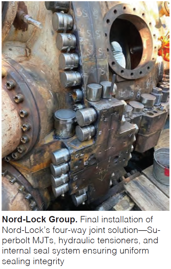Company provides engineered solutions addressing persistent leakage and maintenance issues at turbine four-way joints and coupling interfaces. The four-way joint design combines a variety of custom solutions to correct cylinder misalignment and achieve uniform tensioning. The system integrates an internal sealing assembly with adjustable retainers that prevent air escape and accommodate thermal expansion during operation.