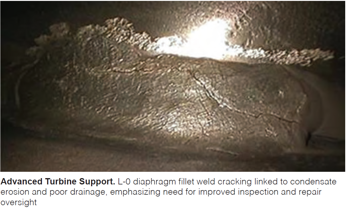Identify critical spares. Priority components include diaphragms (with L-0 fillet-weld issues), rotors, HP/IP front-end blades, L-0 mid-span sleeves, stationary packing and heads, valves, bearings, and oil-system hardware.