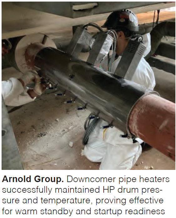 An evolving HRSG warming concept, verified in an EPRI project, uses custom heating panels and PLC control to maintain ~200°F in HP drum downcomer piping with ~300 kW power; test demonstrated maintaining ~20 psig drum pressure for hours and reduced thermal shocks compared to sister unit.
