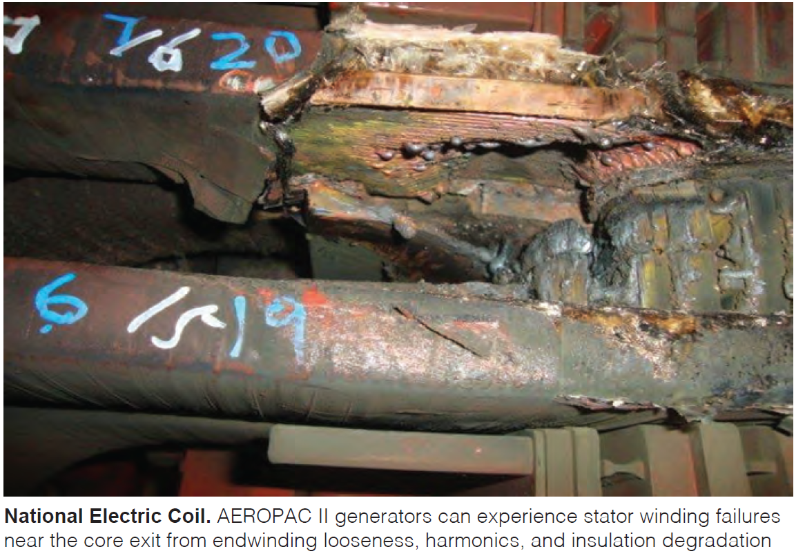 AEROPAC II (GVPI) machines show PD, end-winding looseness/harmonics, slot movement, and end-winding failures near the core exit; diagnostics emphasize bump tests, EMI/PD monitoring, and borescope inspections. Solutions range from pole-to-pole hardware replacements (connectors, shrouds, radial blocks) to selective stator rewinds, sometimes converting GVPI to conventional systems.