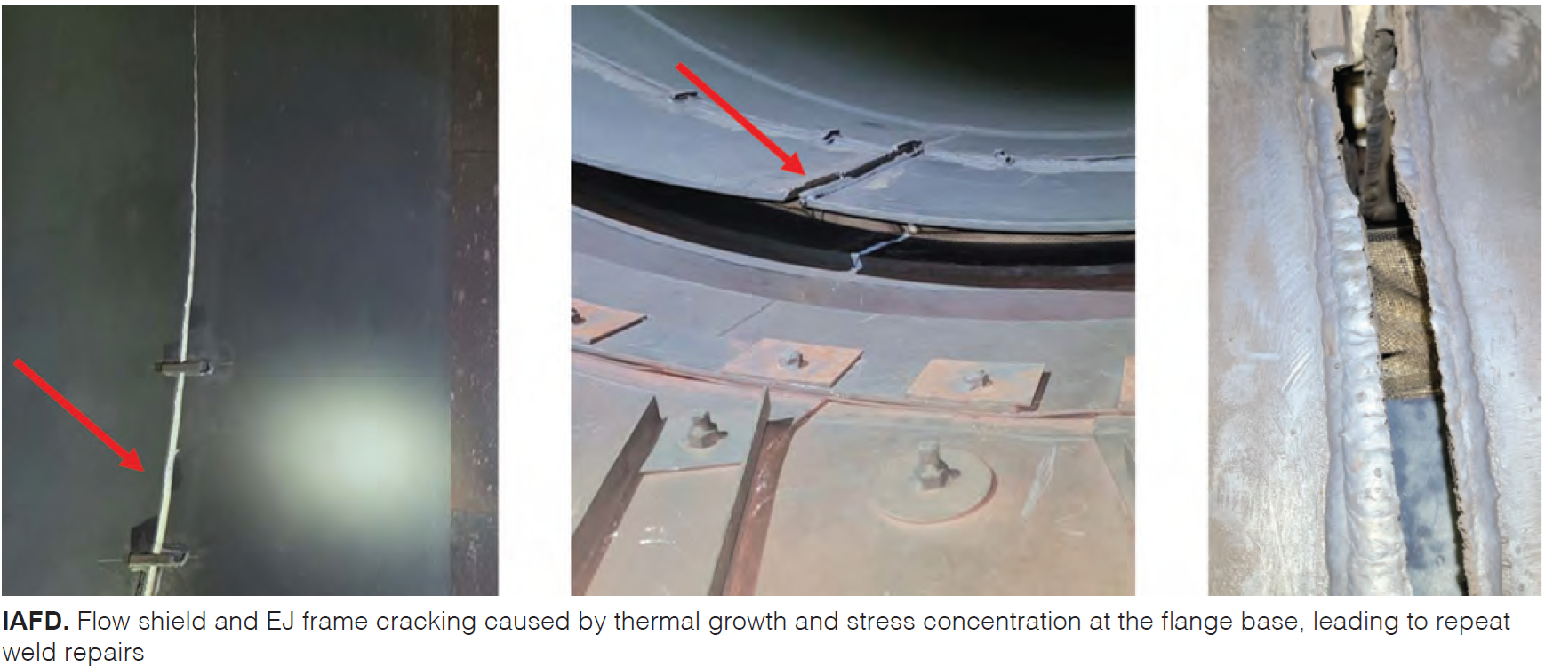 IAFD recommends redesigned flanges that accommodate thermal growth and flexible, heavy-duty PTFE-based joint materials with improved insulation to resist fatigue and flutter. Thermographic inspections reveal consistent liner plate deterioration, misaligned overlaps, and insulation breakdown contributing to localized hot spots.