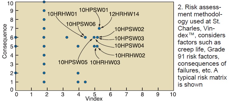 SI’s first step in making a timely transition from the facility’s traditional HEP asset-management roadmap to “smart data” monitoring was a risk assessment. The methodology used is known as Vindex™ (for vulnerability index). It considers factors such as creep life, Grade 91 risk factors, failure consequences, etc (Fig 1).