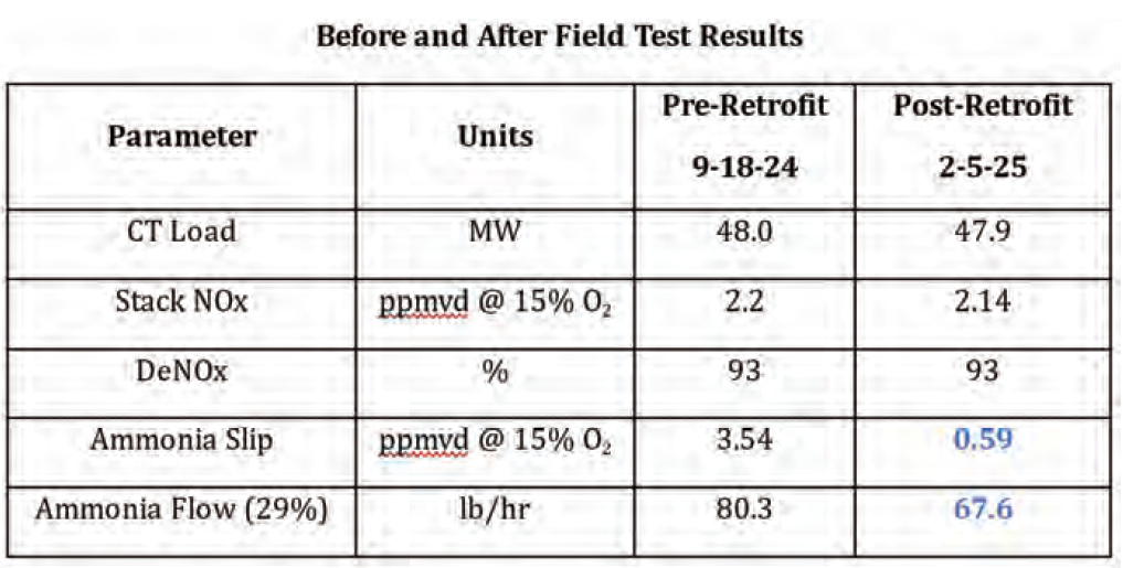 After the AIG was installed, MID ran a stack test to confirm the stack NOx, ammonia slip and ammonia flow (Fig 2). The table below shows a comparison of the before and after results where ammonia slip and consumption was reduced by 83% and 16% respectively.