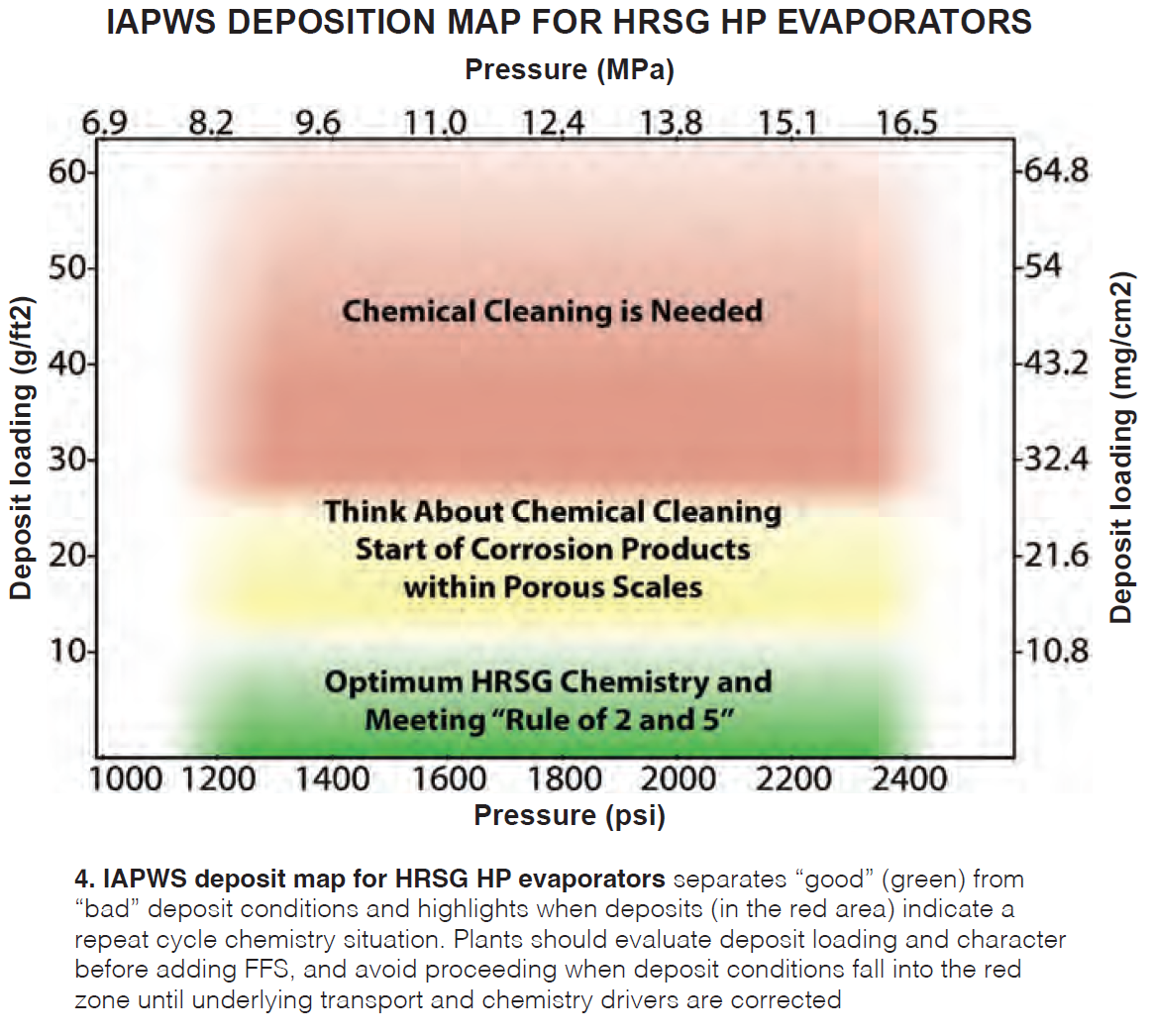 - Deposit screening. For HRSG HP evaporators, deposit loading should be assessed and compared to IAPWS deposit mapping guidance. Plants in a repeat cycle chemistry condition should not proceed with FFS until underlying issues are corrected. It was also shown that deposit analyses are equally applicable for fossil plant waterwalls (Fig 4).