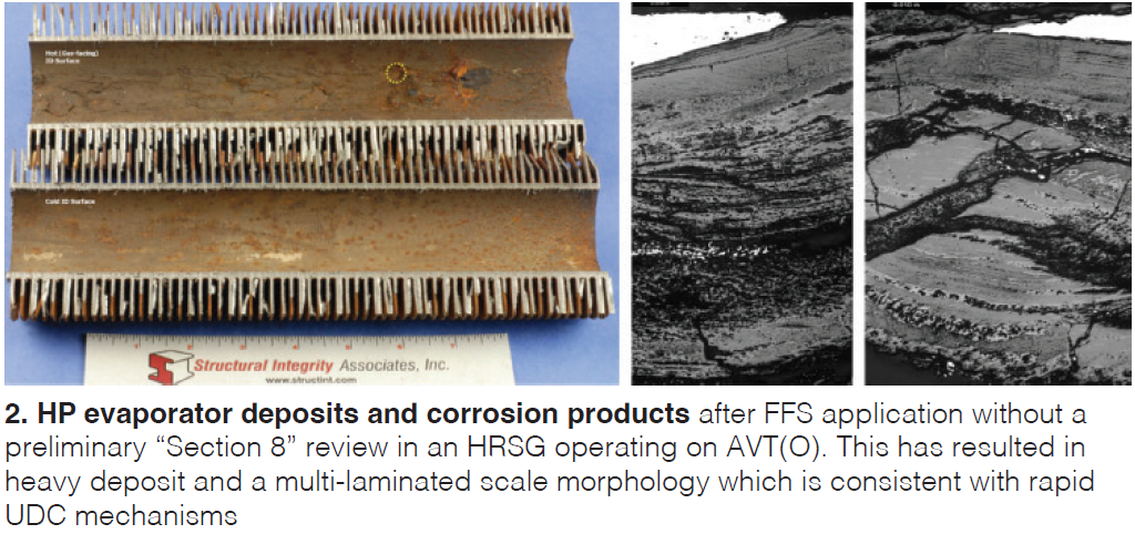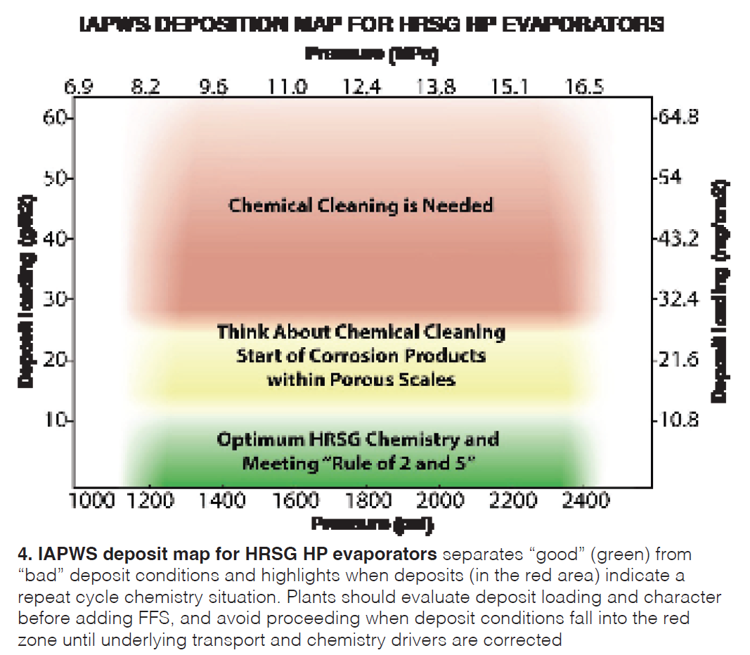- Deposit screening. For HRSG HP evaporators, deposit loading should be assessed and compared to IAPWS deposit mapping guidance. Plants in a repeat cycle chemistry condition should not proceed with FFS until underlying issues are corrected. It was also shown that deposit analyses are equally applicable for fossil plant waterwalls (Fig 4).