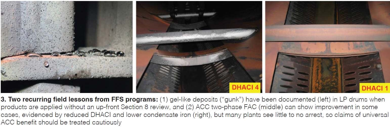 A large portion of the webinar focused on adverse experiences reported in the industry when FFS are applied without understanding baseline conditions. Dooley listed outcomes that have been associated with poorly controlled application in some plants: increases in internal deposits, under-deposit corrosion and tube failures, gel-like deposits in drums and non-heat-transfer areas, turbine deposits, and plugging of strainers and filters.