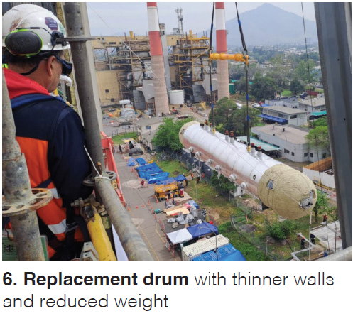 In this replacement case, for example, drum wall thickness changed from 5 in. to 3.5 in. and drum weight changed from 265,000 lb to 170,000 lb. See Fig. 6. Nozzle connections were also improved.