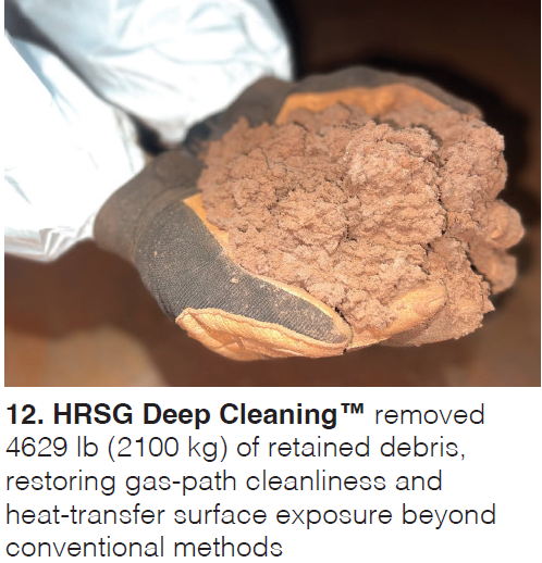 Case studies from Spain and Italy show major debris removal (Fig 12), improved cleanliness verified by borescope inspections, and operational benefits tied to backpressure restoration, including lower stack temperature, higher GT/ST output, and improved heat rate.