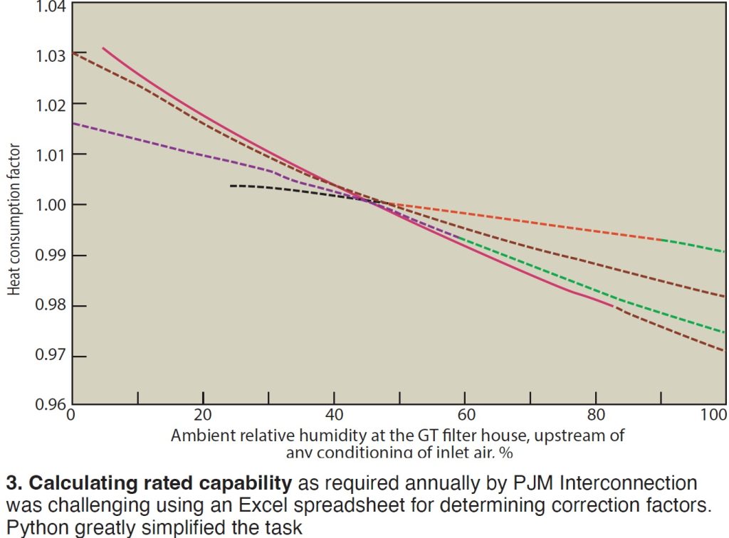 The benefit of using Python for calculation of the iCAP is that it takes the human error out of calculating the iCAP value within the Excel spreadsheet, which required annual updating depending on how ambient conditions differed along with the PJM summer peaks. With Python, the only thing the site team must do is insert the numbers for temperature, barometric pressure, and humidity, and the 15-yr averages for each, into the program and press “run.”