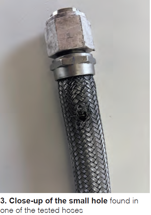 Results. The setup performs as intended. After testing several hoses, personnel identify one hose with a small hole (Fig 3). The site determines this defect is the source of the gas leak within the package. After the hose is replaced, the LEL alarms and gas odor do not recur.