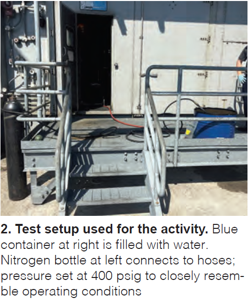 The nitrogen pressure is set to 400 psig to closely resemble operational conditions. The method is intentionally straightforward so it can be repeated periodically without specialized equipment beyond standard fittings, a nitrogen bottle and regulator, and a containment tub (Fig 2).
