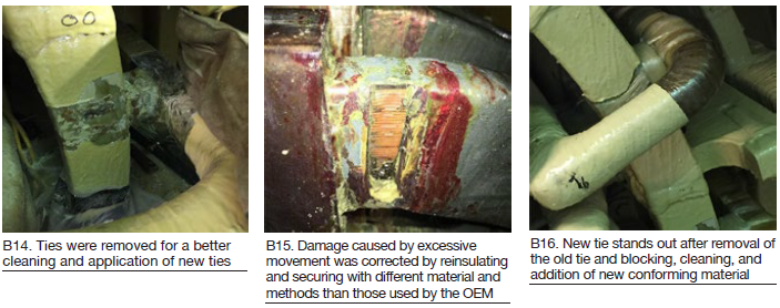Fig B13 shows a continuation of the previous repairs by additional application of epoxy. Fig B14 reveals ties removed for a better cleaning and application of new ties. Fig B15 is the result of excessive movement that dictated reinsulating and securing of components with a different material and by different methods than used by the OEM.