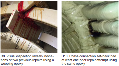 The Siemens Aeropac generator discussed by Derek Hooper, president of BPHASE Inc, a small repair, inspection, and consulting company specializing in gas-turbine generators, was rewound by Alstom in 2014 because of moderate-to-severe spark erosion (Fig B3). Numerous concerns were experienced with this rewind, including the following: injection of clear resin into the dry tie material used made it difficult to determine if the cord was fully saturated (Fig B4), difficulty in obtaining proper series connection alignment (Fig B5), and use of semiconductive packing in the phase-break gaps to attenuate partial-discharge damage.