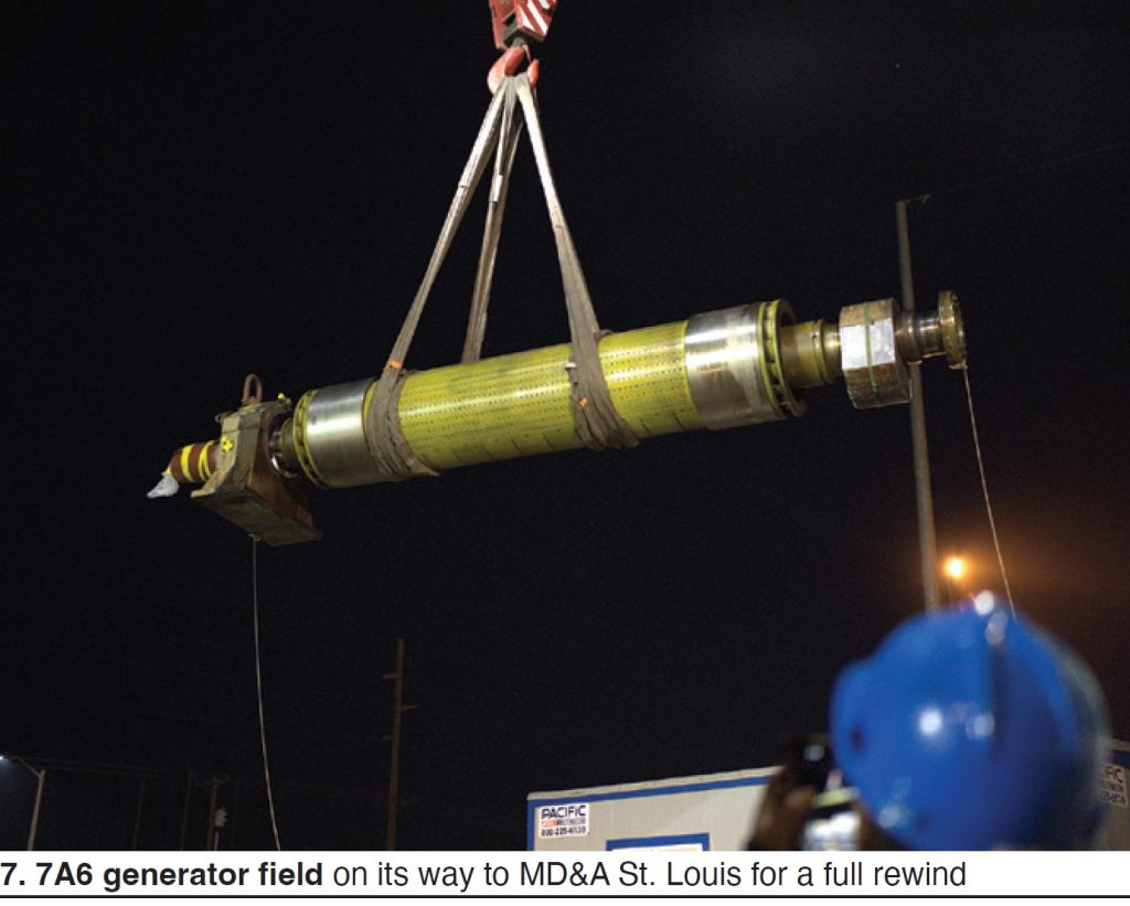 The 7A6 air-cooled generator was disassembled and its field removed and shipped to MD&A’s St. Louis facility for a full rewind (Fig 7). In addition, the company’s Generator Div mobilized onsite to perform a full stator rewind.