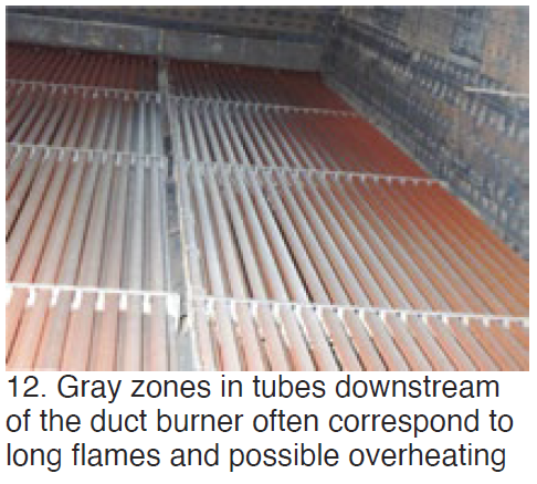 During offline inspections, make note of, and photograph, any color variations in the tube bundle downstream of the duct burner. Gray zones in tubes downstream of the duct burner often correspond to long flames and possible overheating (Fig 12).