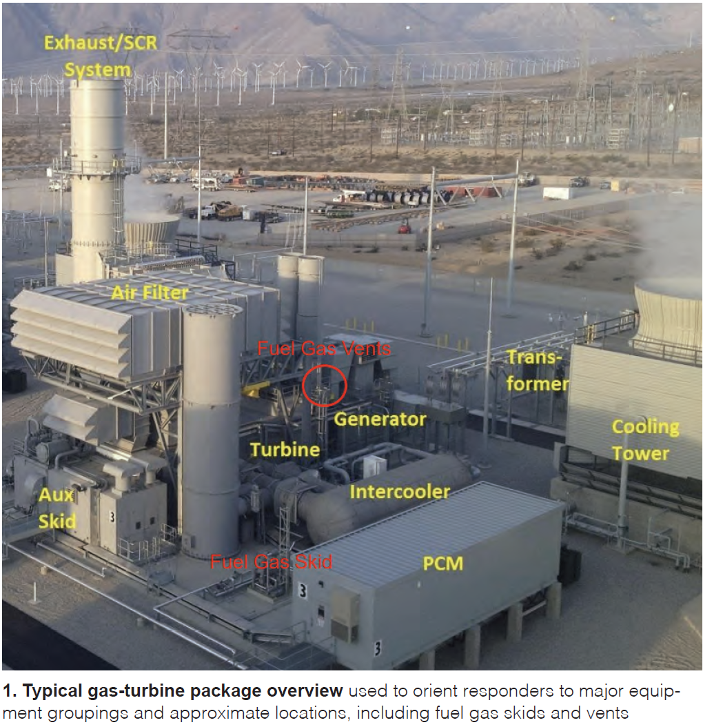 Challenge. Even well-trained emergency responders can be disadvantaged by an unfamiliar site. A gas-turbine-based facility includes high-voltage equipment and overhead lines, pressurized fuel gas systems with vents, combustible adjacent materials, and multiple chemical inventories distributed around the plant. Plant layouts also create navigation and access challenges, especially when equipment yards, switchyards, and fenced areas complicate staging and apparatus movement (Fig 1).
