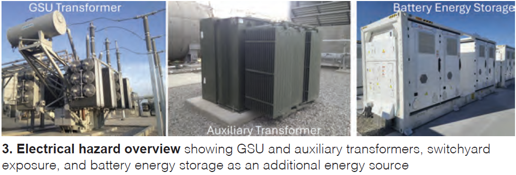 - Electrical hazards. Emphasize GSU and auxiliary transformers, switchyard exposure, and battery energy storage as additional sources of stored or backfed energy (Fig 3).