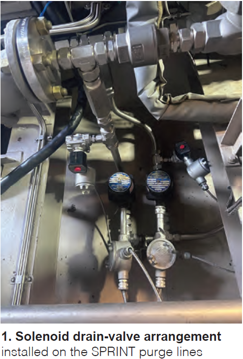 Solution. Added solenoid drains to SPRINT purge lines. Exira installed solenoid drain valves that operate in opposition to the existing instrument-air purge solenoid valves (Fig 1). The design intent is to remove water at the point of entry, before it migrates into the instrument-air header.